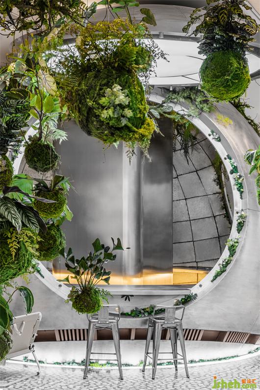 咖啡操作臺(tái)是由廢舊的艙體演變而來(lái),在經(jīng)過(guò)打磨后,它似乎又煥然一新了。機(jī)艙蓋的燈光使整個(gè)咖啡操作區(qū)域變得明亮,也增添了一絲神秘的色彩。周邊是在廢墟上自然生長(zhǎng)的植被。
