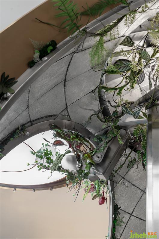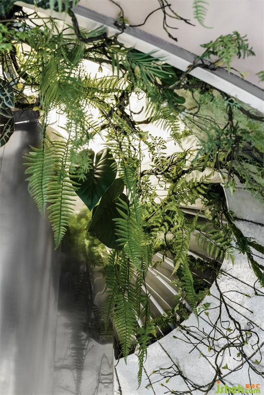 “懸浮”在半空中的長桌源自于切開的樹干,而鏡面材質(zhì)的截面完美的倒映出了窗外高樓林立的世界。舉起咖啡杯,從桌面看到外面的世界的倒影,紛紛擾擾仿佛離著萬年之遠(yuǎn)。