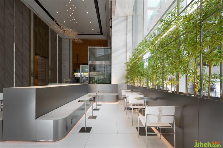本店的客群主體是匯錦金融中心是工作的人,設(shè)計(jì)希望為他們提供一個(gè)工作間隙與好友放松聊天會(huì)客的場(chǎng)所——“城市會(huì)客廳”。設(shè)計(jì)師通過(guò)咖啡吧臺(tái)方盒子與Ticle品牌標(biāo)識(shí)字母“T”空間穿插組合,圍合成品牌標(biāo)識(shí)字母“T”從人視角看是咖啡會(huì)客區(qū),從大堂高層向下眺望會(huì)是平躺的字母“T”,從多種視線角度展示品牌形象。