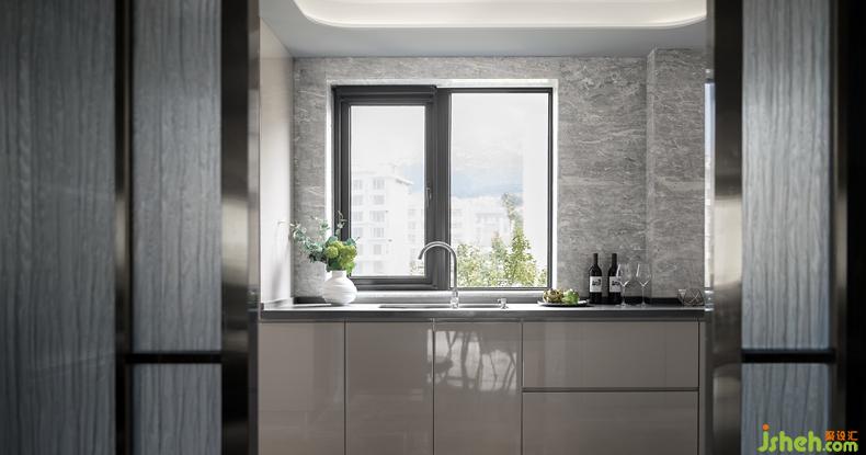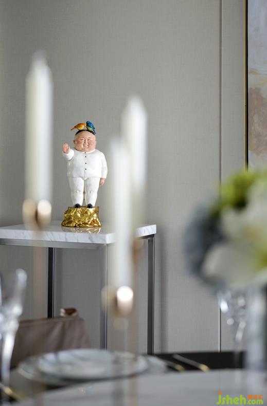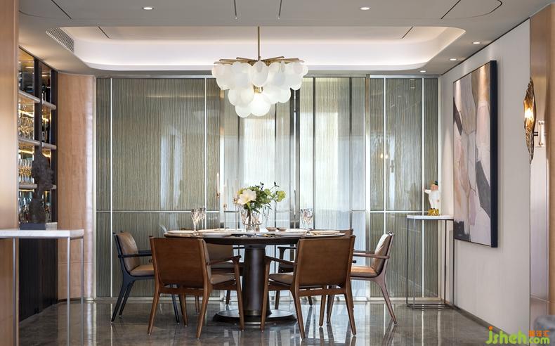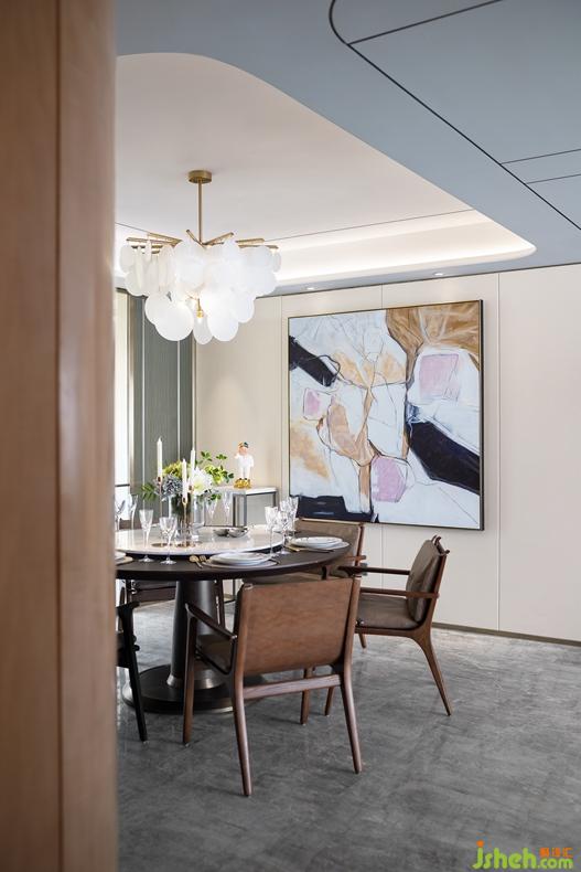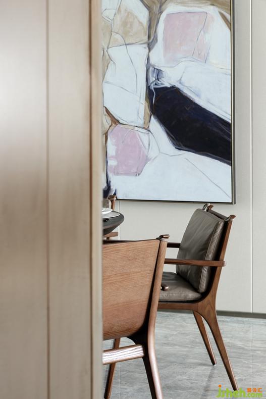 餐廳儲(chǔ)物柜加粗豎向線條分割大空間,細(xì)化直線構(gòu)造出三維層次感,對(duì)應(yīng)墻面的巖石抽象藝術(shù)畫(huà),實(shí)用性與藝術(shù)觀賞性俱佳。