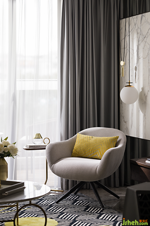 品質(zhì)體現(xiàn)于對細節(jié)的處理,動靜有序,現(xiàn)代而不失沉穩(wěn),設計師用心地在其中找到平衡。圓角造型的沙發(fā)、幾何圖形的地毯和圓環(huán)形的吊燈等陳設的搭配,讓空間顯得優(yōu)雅而有趣味。