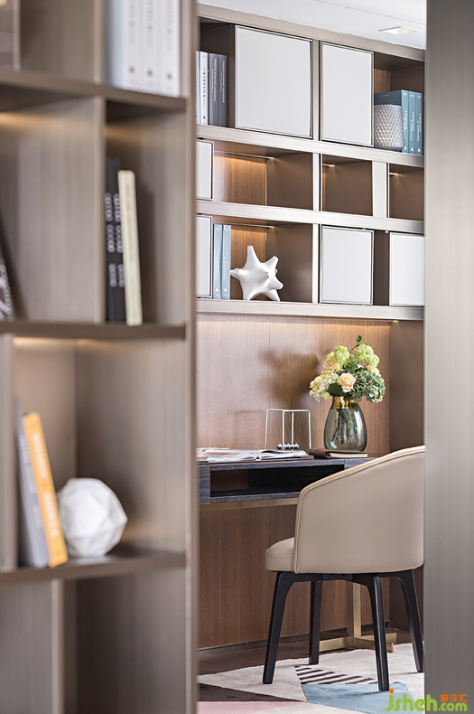 書房呈現(xiàn)半開放的形式,得益于客廳電視背景墻鏡面材質(zhì)的應用,從客廳望去,在無意識中,感覺客餐廳和書房渾然一體,趣味十足。書房懸掛式書架以深色系為主調(diào),散發(fā)出高級質(zhì)感的同時,又具有輕盈的感覺。