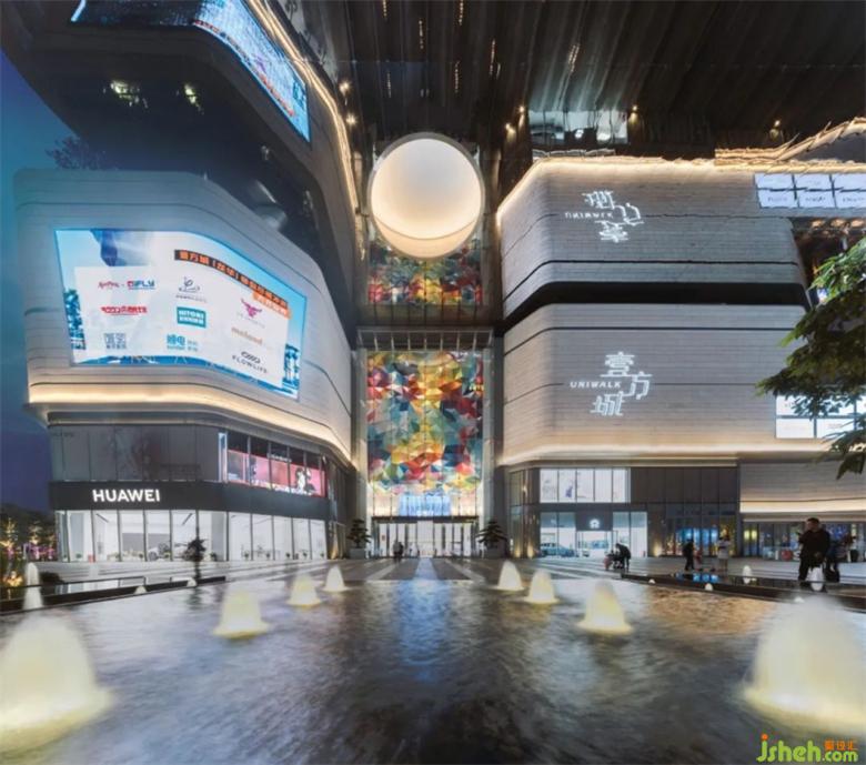 龍華壹方城呈現(xiàn)簡潔-現(xiàn)代的盒子式建筑形態(tài),主入口延續(xù)彩馬圖騰的繽紛元素,商場設(shè)計以炫彩玻璃面與巨型天頂鏡面形成視覺焦點(diǎn),商場設(shè)計強(qiáng)化入口的記憶點(diǎn)與引導(dǎo)性。