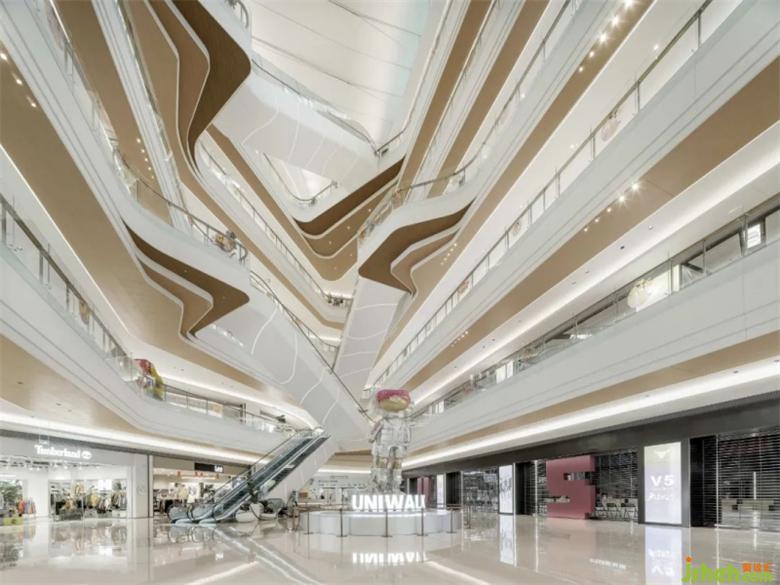 室內(nèi)空間以海浪、礁石為設(shè)計靈感,融合整體建筑曲線,營造出流動的力量感。商場設(shè)計石材的硬質(zhì)與木飾面層疊出海浪的蜿蜒涌動,兩種材質(zhì)剛?cè)岵?jì)的碰撞穿插,創(chuàng)造出空間的層次與深度,展現(xiàn)生生不息的靈動之美。