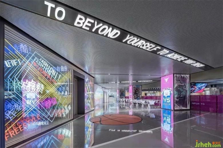 運用高飽和度的炫彩霓虹線性燈光,構(gòu)建娛樂性標語昭示面,形成強烈視覺焦點匯聚;商場設(shè)計天面嵌入金屬黑白撞色字母LED燈帶,與地面籃球、跑道等運動風格貼畫,打造時尚運動風格。