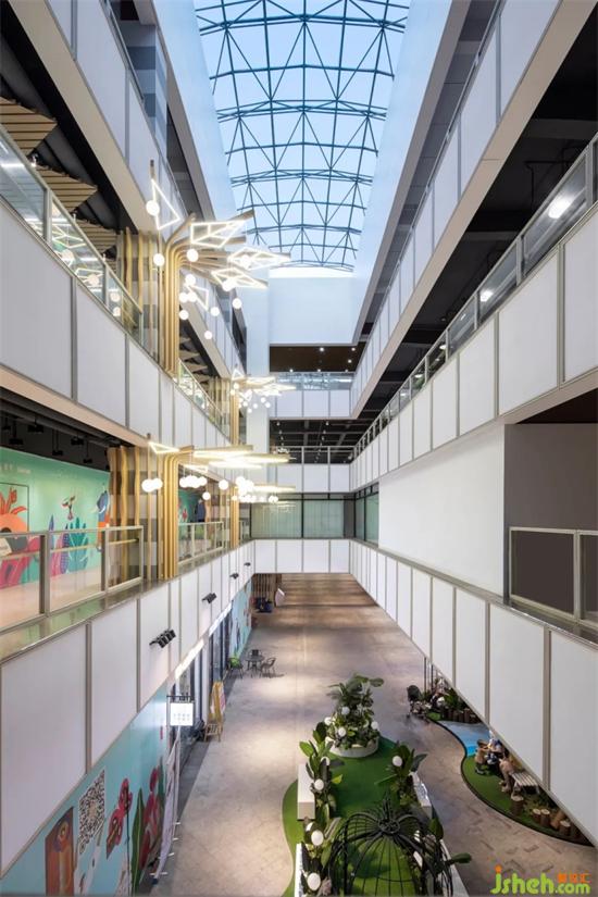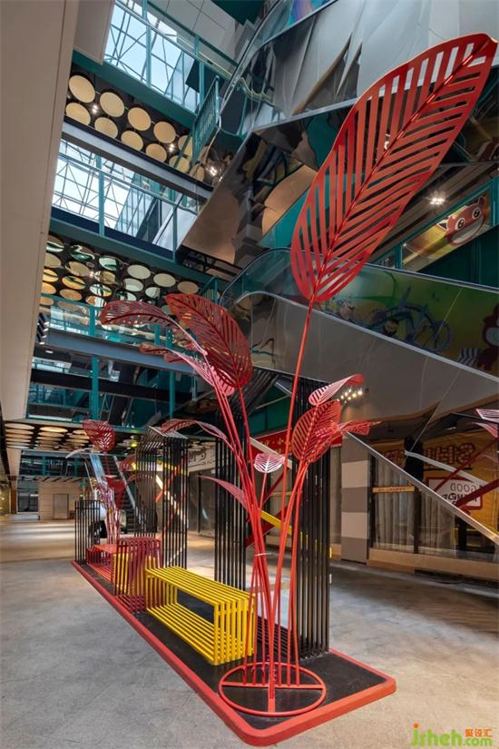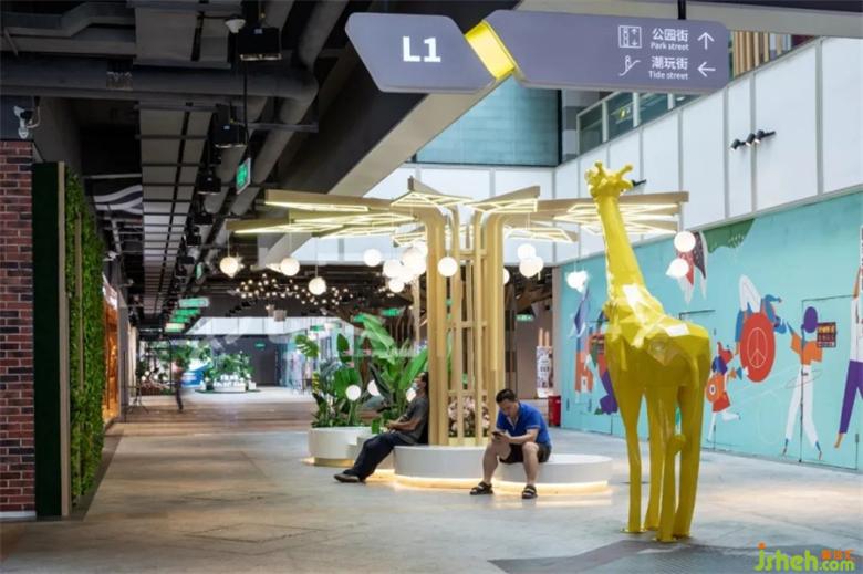 設(shè)計(jì)師應(yīng)該在內(nèi)外尺度中與商業(yè)和公共區(qū)域的關(guān)懷找到平衡點(diǎn)。商場設(shè)計(jì)公園街以色彩明麗造型極簡為主,加以綠植點(diǎn)綴,讓整個空間氛圍變得清新和靈動。