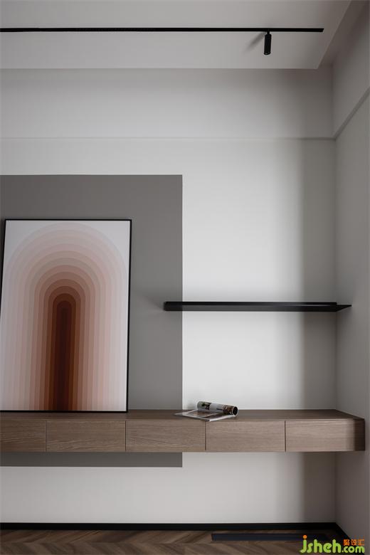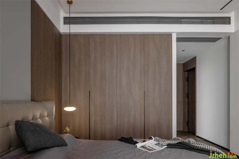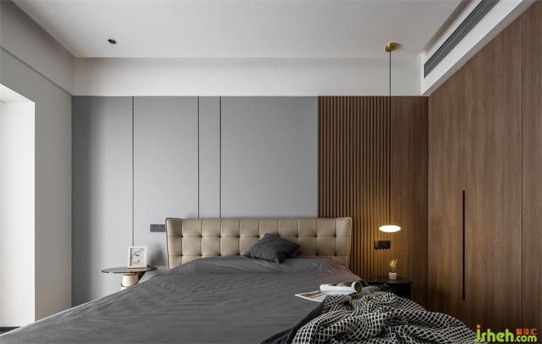 主臥內(nèi)斂灰色和胡桃木在規(guī)整中相互映襯靜謐的空間節(jié)奏加上藝術(shù)化的展示,設(shè)計師試圖通過純粹的視覺感官