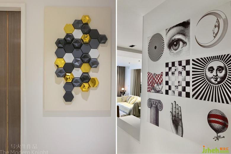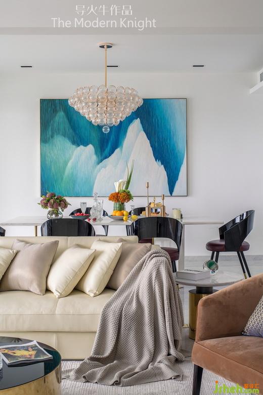 客廳精選了一幅意大利創(chuàng)意藝術(shù)家Fornasetti的經(jīng)典拼圖系列,餐廳的藝術(shù)畫作是我們工作室用找來的素材改良而成,靈感來自極光和《星際穿越》米勒星球的海浪,畫幅2.2米X1.4米,剛好能進(jìn)電梯,由Willart畫師繪制,筆觸細(xì)膩豐富,過道則用皮料打底的手工樹脂立體畫做點(diǎn)睛。