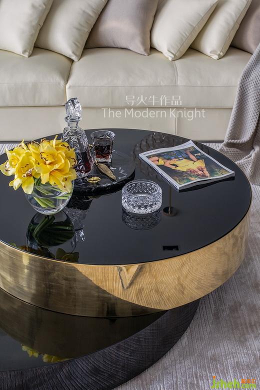 黑檀木和香檳金組合而成的雙層圓形茶幾,與柔美的象牙色真皮沙發(fā)和地毯形成剛?cè)岵?jì)的材質(zhì)對比