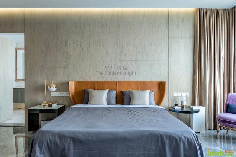 主臥搭配了灰斯影木、熏衣草色和橙色真皮床頭