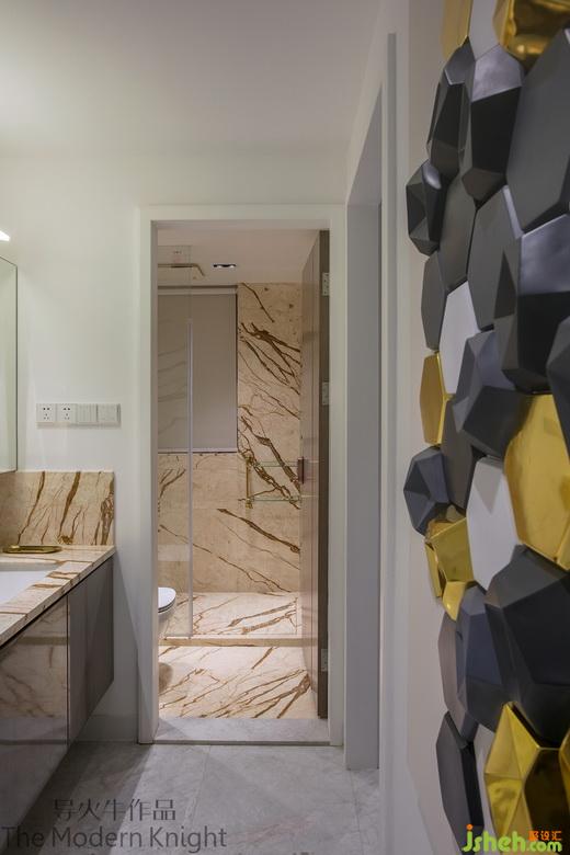 鏡框的玫瑰金、天然石材和灰尼斯柜門