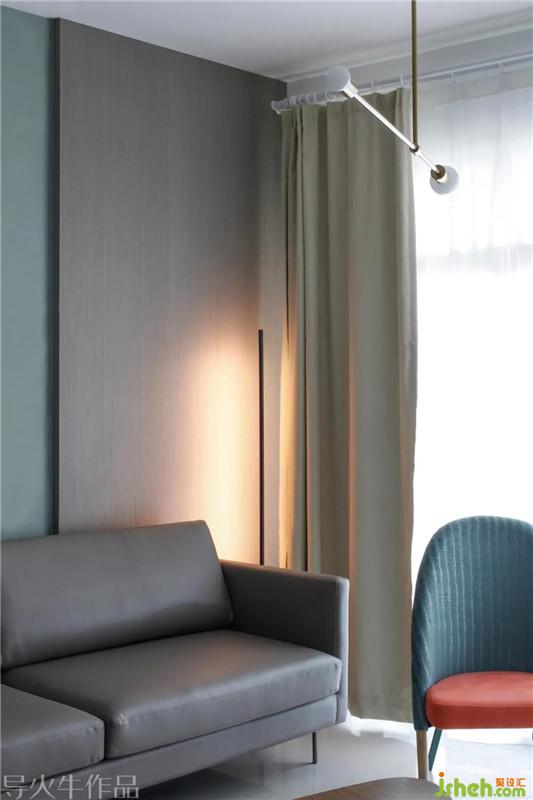 孔雀綠單人椅是客廳的一抹亮色。