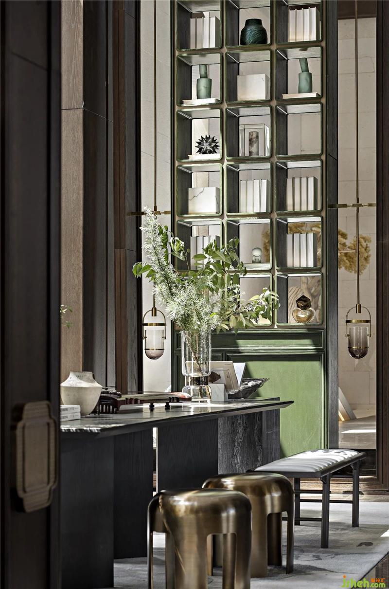 前廳對稱式格局,凸顯和諧之美。不規(guī)則冰棱柱吊燈,將流水凝聚于此,祖母綠通柜好似巍峨的山峰,靜靜佇立。在空間中山水縱橫交錯,猶如走進畫卷之中。