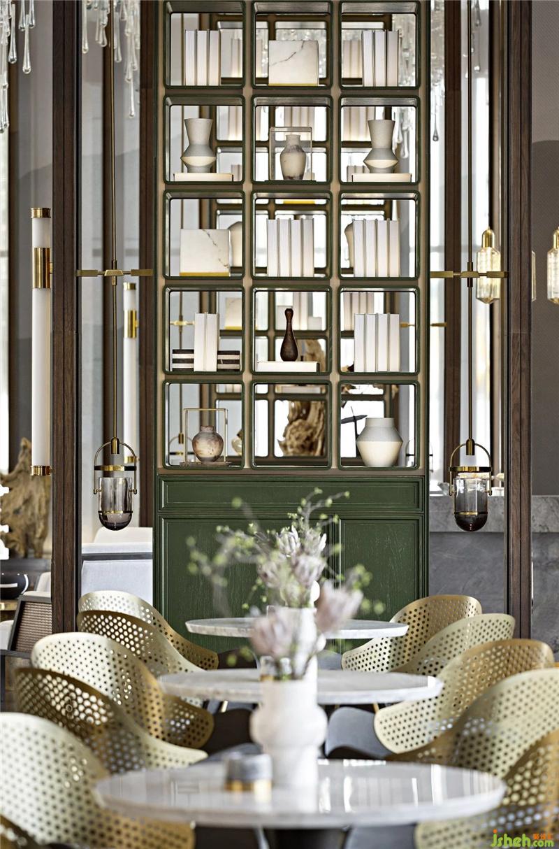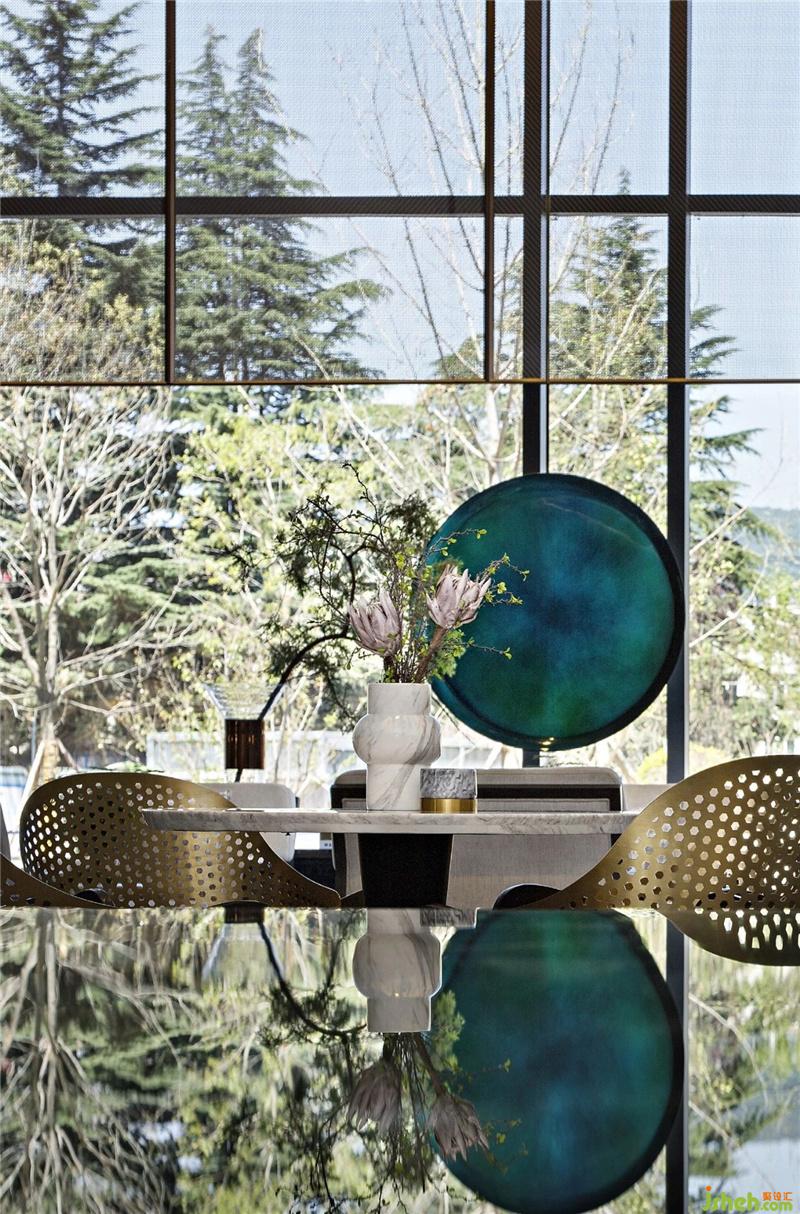 書香之中,細節(jié)處處可窺。精美的收藏品與書融為一體置于祖母綠通柜,落座處就能看見盆景和山石,自然與文化緊密相連,每一個角度都能成為一幅空間畫卷。