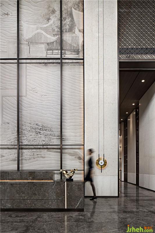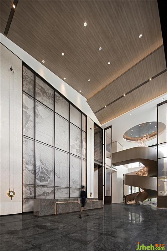 接待前廳上方采用嶺南傳統(tǒng)的屋頂元素,以現(xiàn)代手法進(jìn)行重構(gòu),通過現(xiàn)代材質(zhì)表現(xiàn)新中式融合風(fēng)格,展現(xiàn)了傳統(tǒng)與現(xiàn)代設(shè)計(jì)的共鳴。讓室內(nèi)拱形框架去肉存骨,經(jīng)絡(luò)硬挺,氣韻渾然,似“山”形、又似“人”字的架構(gòu)融山入室,寓意著人景相融、天人合一。