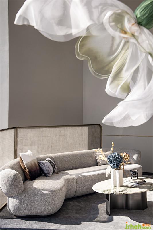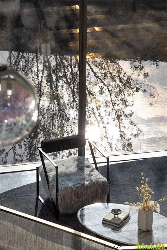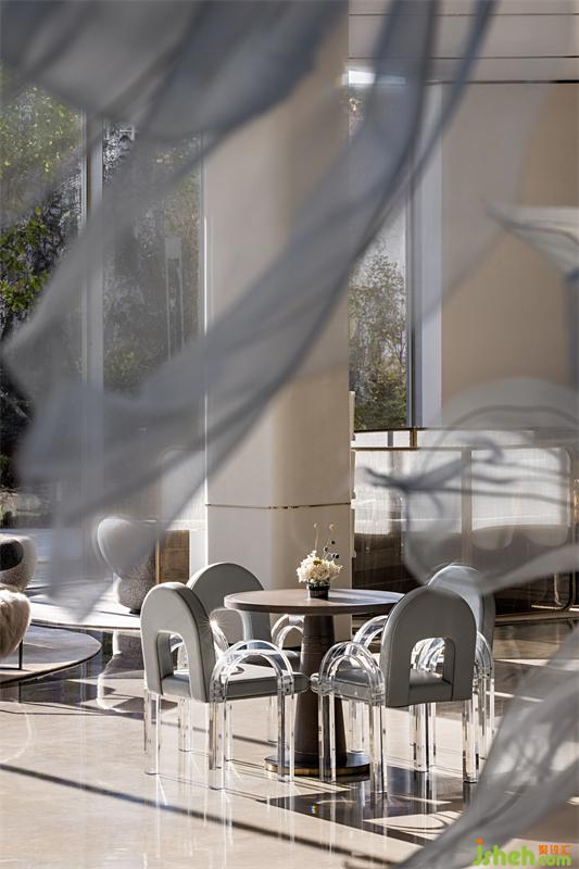 大面積的玻璃落地窗,讓自然光線進入,若即若離的景色變化以及戲劇性的情感體驗,激發(fā)訪者的想象情境;在樹影點光的映射下,置身于弧形洽談區(qū)之中,仿如被空間包裹著。營銷中心設計在弱化空間界限性的同時,希望訪者憑借內心的回憶為空間添上顏色。