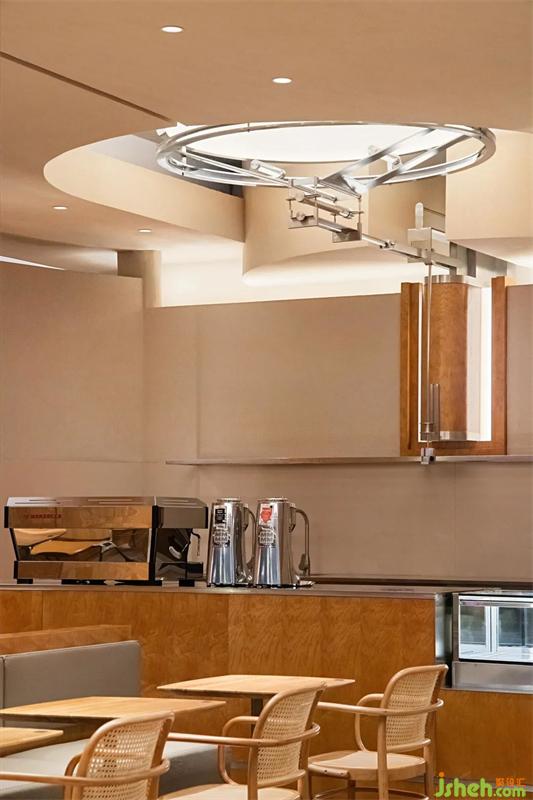 木與金屬、幾何形體與弧線穿插疊加,模糊空間邊界的同時,餐廳設(shè)計打造虛實交錯的沉浸式感官體驗。