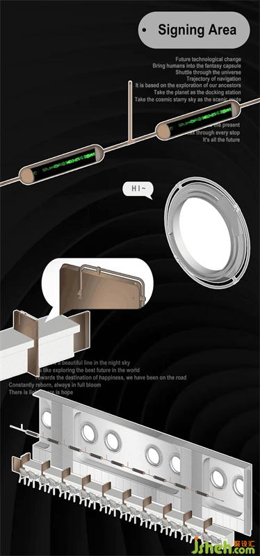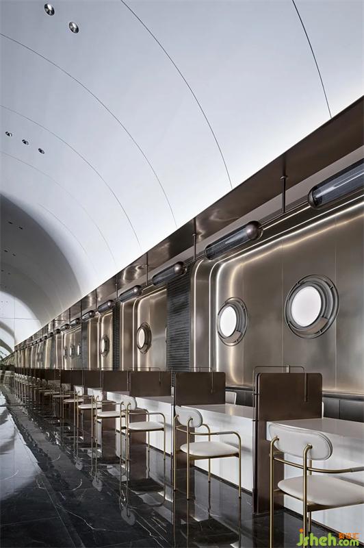 空間所引導(dǎo)的行為和體驗,較之前場區(qū)域形成了某種情感上的遞進,而這一部分,由通過金屬材質(zhì)的對比、圓形尺度的掌控,抽象的星際專列由此予以實現(xiàn)。
