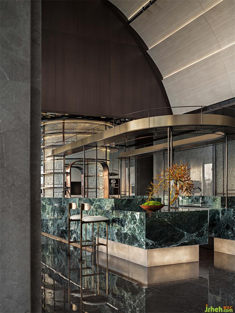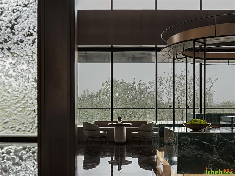 設(shè)計師在空間視覺的描繪上,往往是感性填充的,在這里,我們通過仿似拱形船艙的入口,看到波光粼粼的天空,這與真實的場景視乎有所偏離,這種江與天之間模糊的錯位的形象替換,正是設(shè)計師所思考的空間的詩性——秋水共長天一色之境。