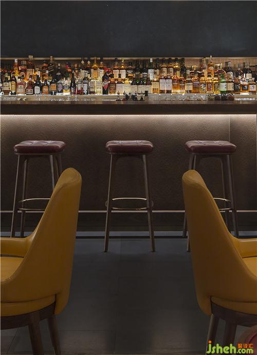 威士忌吧臺則呈現(xiàn)開放的狀態(tài),深色背景下,狹長的酒品展示臺,半明半暗臺面,光線穿過整面酒品墻,最終匯集到玻璃臺面處,繪出一幅如琉璃般晶瑩,似雕花般琳瑯的長卷。