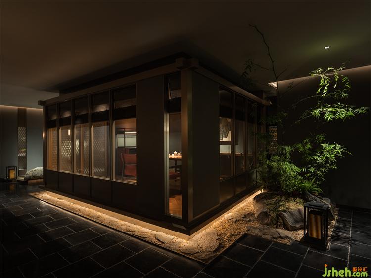 四周碎石鋪地,長燈環(huán)繞,如臨空起,借水榭形式,龍吟九品餐廳設(shè)計配以落地長窗,兩面借景,雖在城市而得山林之樂。