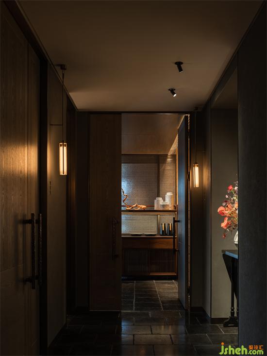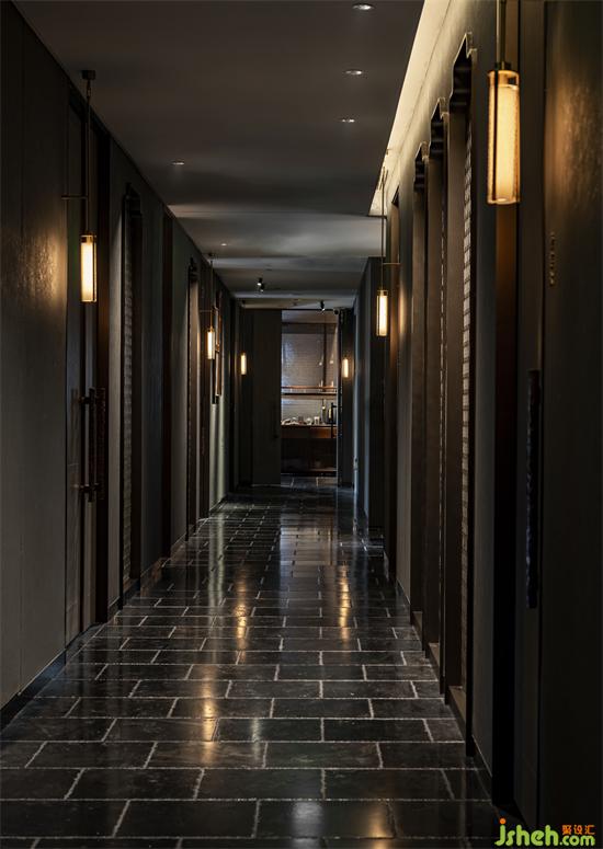 走廊處狹長形的縫隙空間被景觀占據(jù),食客漫步時,落座包廂時,可窺山石松翠,龍吟九品餐廳設(shè)計極少面積的景觀滿足多個包廂的視野需求,移步換景,鬧處尋幽。