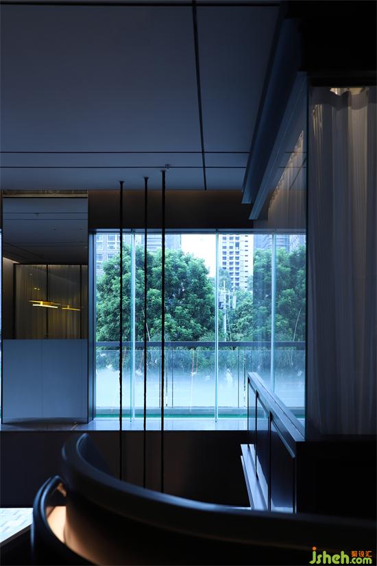 充滿儀式感的景觀廊道,郁郁蔥蔥,似清幽別院,徐記海鮮餐廳設計以優(yōu)雅的歡迎姿態(tài),引人入勝。目之所及,大尺度的樓梯“攀附”著大面積的落地玻璃,宛如活物,置身林中,蛇形而上。