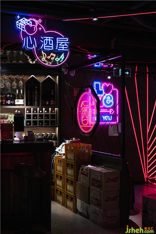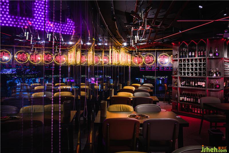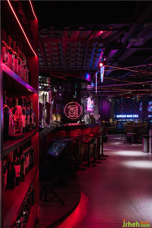 入口處的走廊設(shè)計(jì)采用發(fā)光色的樓梯,壓低自然光線對(duì)室內(nèi)的影響,燈帶的變換,讓整個(gè)大廳充滿著火熱與延伸感。室內(nèi)的燈光情境更加突出了,使入口空間夢(mèng)幻且別具一格。店里的燈具主要采用logo的形狀,充滿著音樂(lè)酒館的感覺(jué),天花的投影設(shè)計(jì)也恰到好處,從現(xiàn)場(chǎng)看燈光的投影照射到每一張桌子,層次感極佳,氛圍感也很到位。