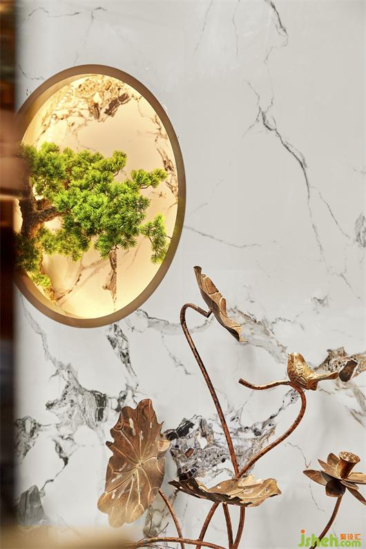 本案在“簡(jiǎn)”與“奢”之間尋求平衡,以新中式輕奢為主體基調(diào),餐廳從外至內(nèi)給人以明亮、大氣之感。夜晚,店門上醒目的金色店名,更有畫龍點(diǎn)睛之意喻。正門的景觀為中國(guó)傳統(tǒng)元素荷花池與迎客松,寓意傳承匠心品質(zhì),喜迎迎八方來客,盡顯傳統(tǒng)文化韻味。