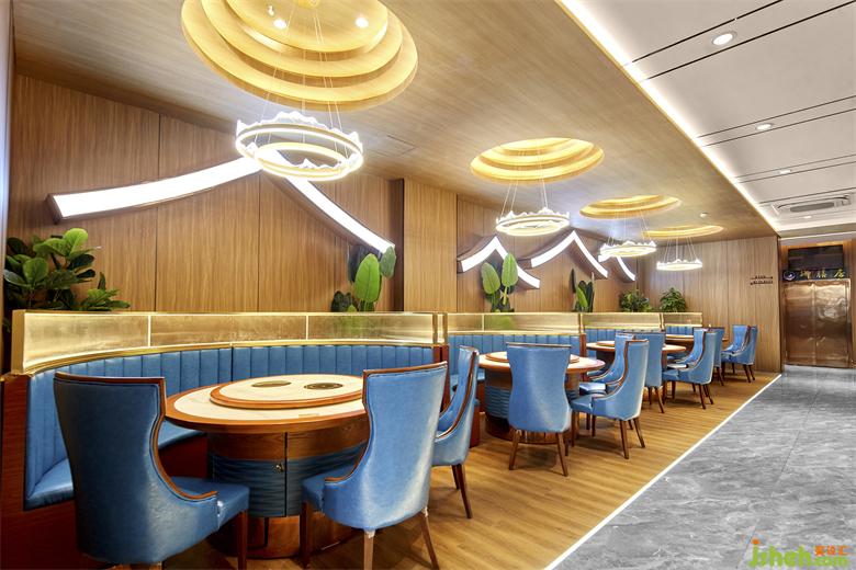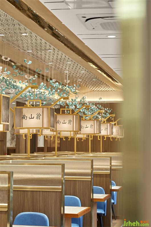 在開(kāi)放的餐桌之間,設(shè)計(jì)師都運(yùn)用了半高的木質(zhì)隔擋形成卡座區(qū),把空間介于“隱”與“顯”之間,而隔擋上的藝術(shù)玻璃,則增添了感知層次和視覺(jué)趣味??拷斑叺目ㄗ?,設(shè)計(jì)師采用了鏤空魚(yú)鱗紋隔斷屏風(fēng),這是將傳統(tǒng)文化抽象成簡(jiǎn)單的圖像符號(hào),融入空間之中。
