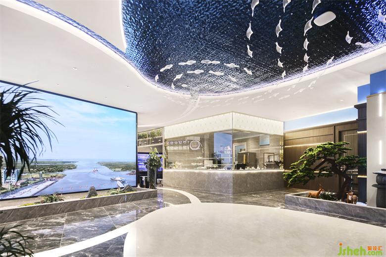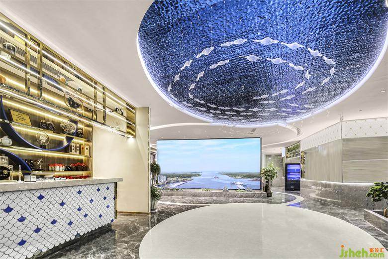 海鮮餐廳設(shè)計餐廳門口巨浪與大地豎起了堤岸,珊瑚與浪潮共繪著圖騰。海底藍(lán)洞的大門敞開,由外至內(nèi)給人以寧靜純粹的藍(lán),靜謐中又帶兩分魅惑,引人入勝。
