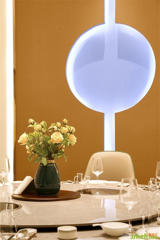LED顯示屏配合魚群吊燈,映射在灰白大理石的紋樣上,至真至幻,水波蕩漾。既呼應(yīng)了餐廳的特色,又讓空間飽含深海的環(huán)境元素,視覺上營(yíng)造出動(dòng)態(tài)、自然的質(zhì)感。