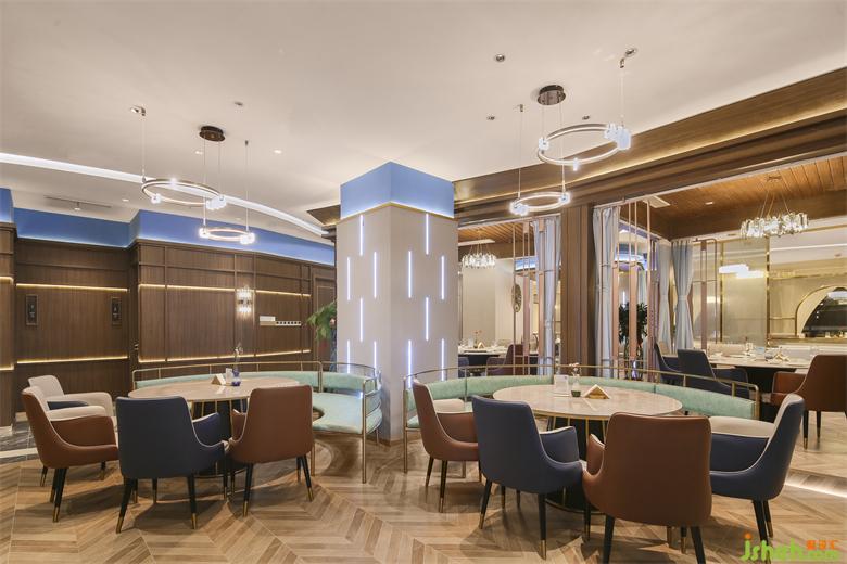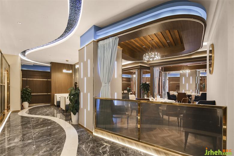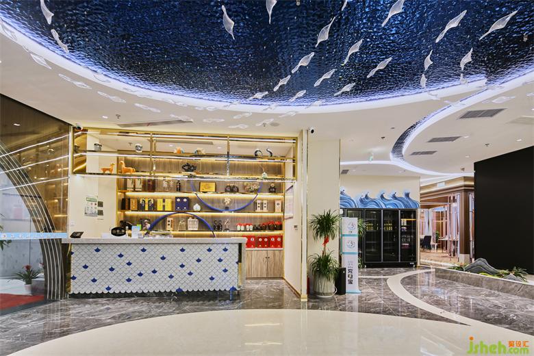 連接各個空間的廊道則由藍(lán)色浪潮凝固成靈動蜿蜒的照明系統(tǒng)引路,“奔流”然后在視線盡處消失。海鮮餐廳設(shè)計(jì)綿延之水懸浮于頭頂,指引著地下白色海岸地磚的方向,將一切籠于其下。鋪陳開流暢的室內(nèi)動線,共同鑄就空間的內(nèi)建筑感。