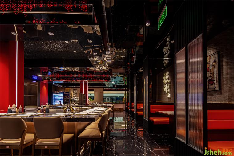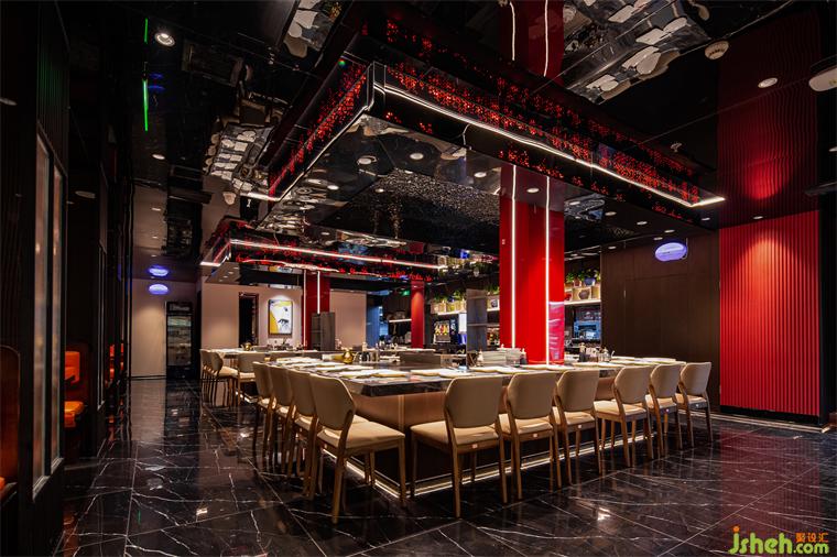 本方整體的硬裝上提取自然的大地色調為設計語言,并結合屋頂紅色方塊,點亮空間色彩,鐵板燒設計多種材質運用,天然紋路理石、工藝精良的金屬、侘寂自然的材料,意在彰顯空間的流動之美。