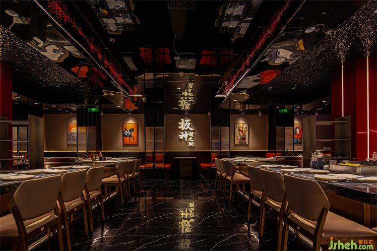 門口升騰火焰的壁爐是點睛之筆,增加用餐氛圍的煙火氣,與橘黃色不規(guī)則的燈光映照下,里面有著無盡的富藏和溫度,與“板神新之助”的logo相呼應,帶來神秘純粹的意境。