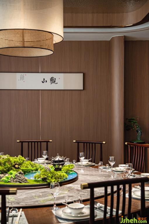 上方的水波紋吊頂,恰似讓泉水面粼粼的波光。形態(tài)各異的燈具設(shè)計,通透的竹子圖案、藤編的造型、褶皺紙面的質(zhì)感,讓人不禁聯(lián)想到瑯琊山上的一草一木,以及草木制成的畫紙。金屬材質(zhì)的古典紋樣屏風(fēng),營造了若隱若現(xiàn)的朦朧意韻。墻面詩詞的內(nèi)容畫卷遙相呼應(yīng),描繪滁州的山川河流,增添了空間的藝術(shù)感。桌椅的材質(zhì)采用天然木材,保留原始紋理,質(zhì)樸中透著自然之美,搭配桌面的花藝微景觀點綴,仿佛置身于滁州的山野之中。