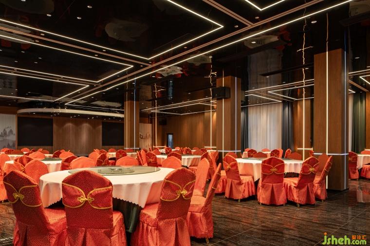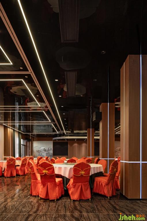 璀璨的燈光如同夜空中閃爍的繁星,灑落在紅色的桌椅和光潔的地面上。空間以紅色為主色調(diào),輔以原木色,營造出了喜慶而熱烈的氛圍。墻面的水墨畫勾勒出山巒的起伏與揮手相招的迎客松,既有古典氛圍,又展現(xiàn)了對食客的熱情。