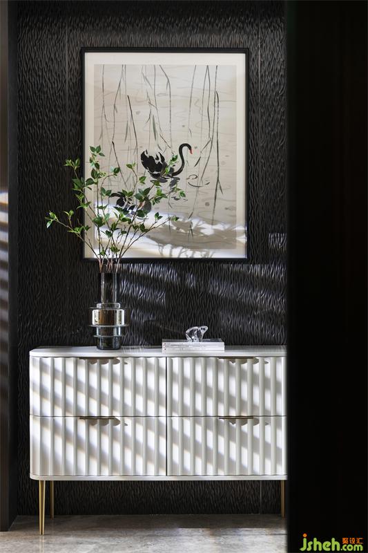 進入玄關,我們采用了東方水墨色留白的反差視覺體驗,畫中的天鵝在水中高雅的情調(diào),柳條輕盈的垂落下來,與臺面的花藝虛實結(jié)合融洽和諧,材質(zhì)特性讓室內(nèi)陽光灑入,溫暖流淌。