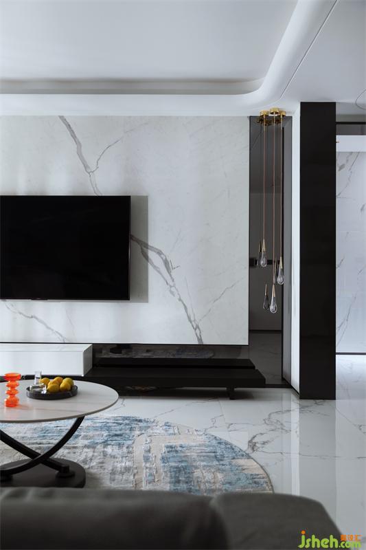 飛舞在米白色柔軟的沙發(fā)組合上空,上下呼應呈現(xiàn)出了強烈的藝術美感,令人沉浸其中。黑色直線的高窄黑玻隔墻打破潔白墻面的無趣,黑白強烈的對比,透過黑??梢酝敢暤饺霊羟皬d的空間延續(xù)感,讓入戶者感受到豁然開朗的儀式感體驗。