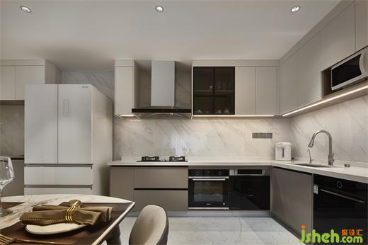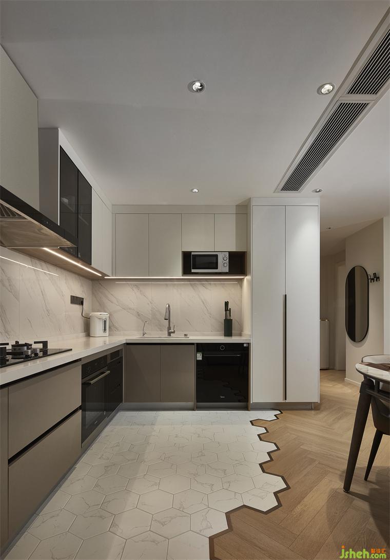 L型設(shè)計(jì),大幅度減少下廚折返次數(shù);白色與木色分離曲線使得廚房更具舒適層次感,簡(jiǎn)易一體臺(tái)面,免除多種復(fù)雜操作。