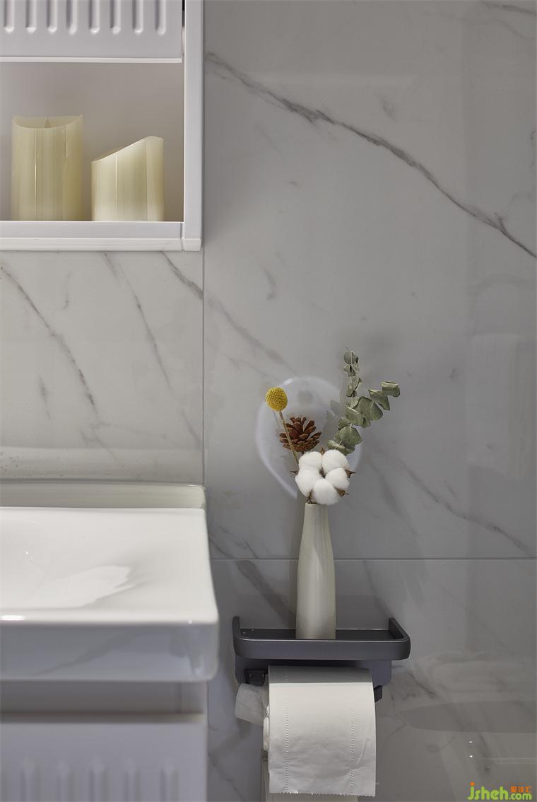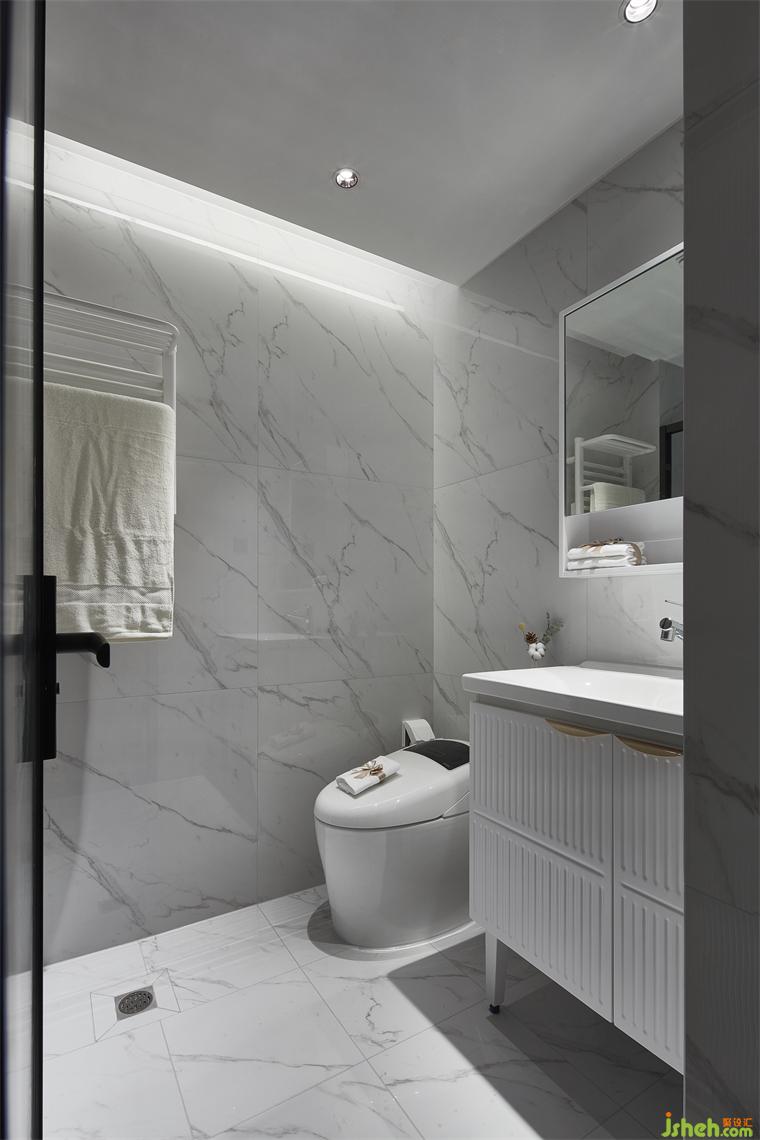 灰紋大理石地磚,整潔明凈,干濕分離。一體化沐浴設(shè)備,流水滴落的聲音,象征著一天的舒適臥躺,即將開(kāi)始。