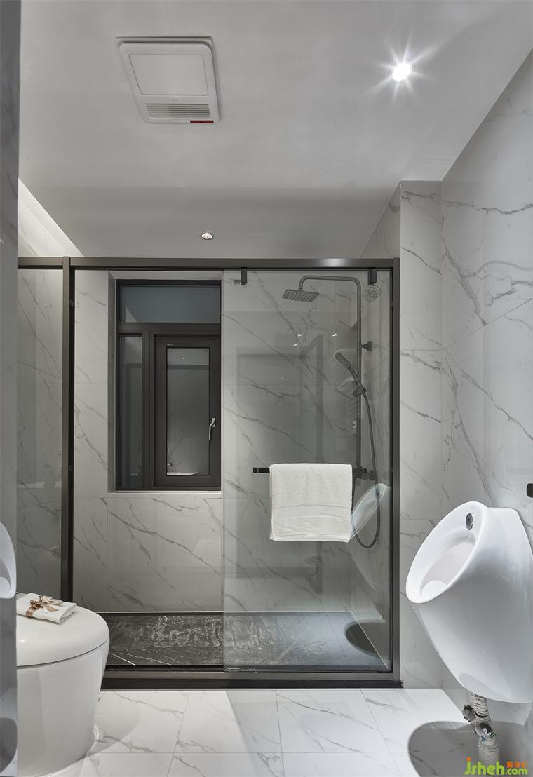 馬桶與小便池分離,干凈衛(wèi)生好處理;沐浴間空間寬敞協(xié)調(diào),燈光明亮具柔感。
