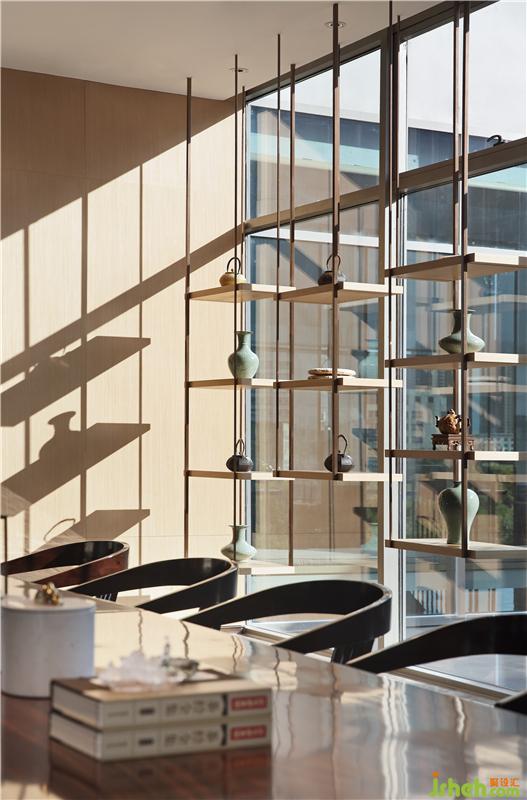 茶葉珍品展示&產(chǎn)品發(fā)布區(qū)是一個(gè)核心的空間,兼具大型產(chǎn)品發(fā)布及會(huì)議的功能,空間的南北邊使用了雙開的移門,可在大部分的無大型活動(dòng)情況下敞開,令南北動(dòng)線與空間感的通透,更在南北兩端設(shè)置藝術(shù)端景,自然成趣與空間章法。整個(gè)裝飾材料上并沒有選擇貴重的大理石,使用的是仿石瓷磚與淺木飾面,通過中式的展示柜與靠建筑中空區(qū)的藝術(shù)裝置來傳遞空間的氛圍。會(huì)所設(shè)計(jì)