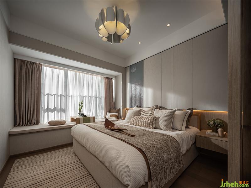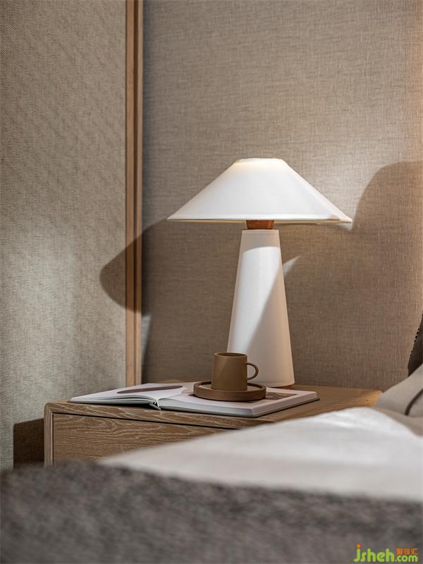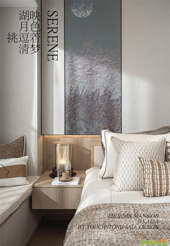 “綠水青山,一輪明月林梢過。石女高歌,古調(diào)無人和。”床頭背景我們樣板間設(shè)計(jì)了一個(gè)手繪墻布,旨在描繪一種月色撩人的情景:臥室窗外月上樹梢,微風(fēng)輕撫,湖光映照,床前夜品香茗,柔和的燈光與月光融為一體,輕照著歲月輕照著你,漸入微夢。