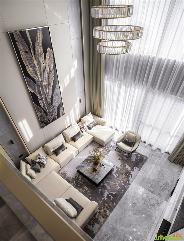 一層的核心空間是客廳,兩層挑空的客廳寬敞明亮,搭配大尺寸的琺瑯琉璃裝飾畫更顯大氣。別墅裝飾金屬元素是輕奢空間不可缺少的角色,客廳的水晶吊燈選用自帶光效的金屬和水晶配合多層疊造型,起到畫龍點(diǎn)睛的效果,營造出輕奢華麗、時尚大氣的空間氛圍。冬日的午后,陽光透過紗簾溫柔灑落,與家人朋友品茗暢聊,好不愜意。