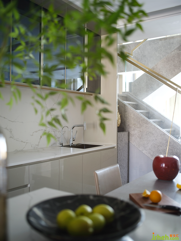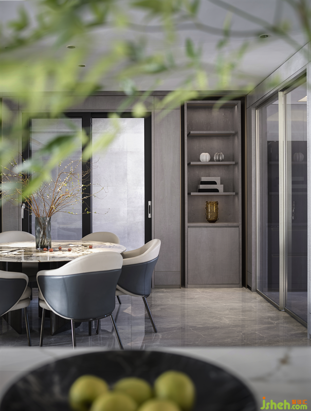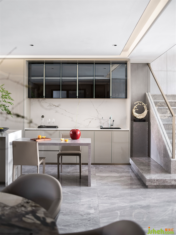 開放式吧臺增強(qiáng)了與餐廳的聯(lián)系,潘多拉奢石的餐桌,華麗卻不艷俗,猶如高貴的女王,氣場全開。餐椅選用簡約卻充滿細(xì)節(jié)的款式,沒有喧賓奪主,猶如溫柔的騎士,低調(diào)沉穩(wěn)。整個餐飲空間的每個角落都散