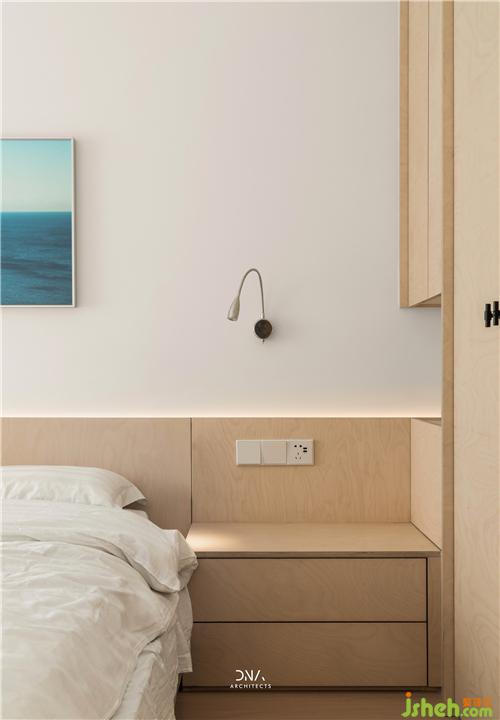 臥室整體延續(xù)了樺木和水泥色的材質(zhì)運(yùn)用,頂面暖色燈帶營造的氛圍消除了水泥的冰冷感。