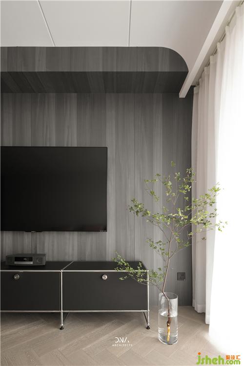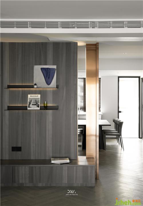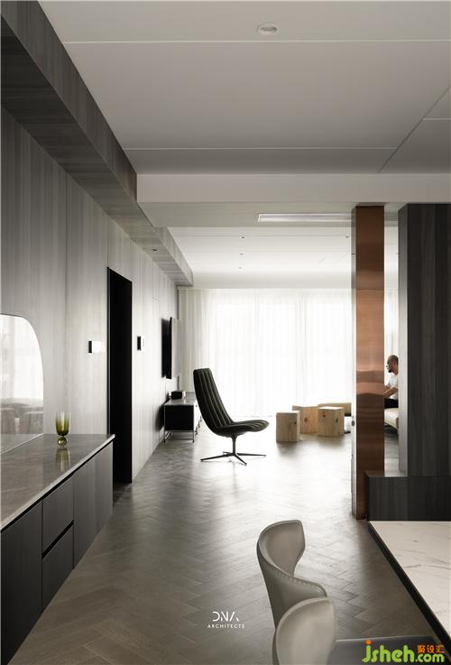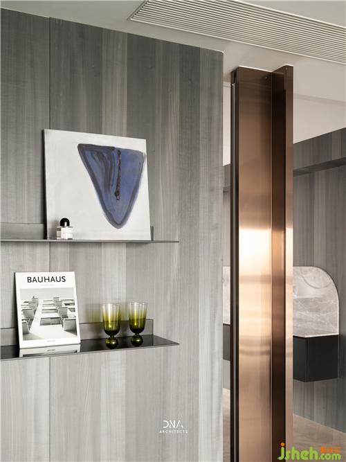 玄關(guān)處,通過石材清晰的線條,隱約的紋理,籠罩出一種包容之感,暗黑中的優(yōu)雅,愈發(fā)顯得意味悠長。