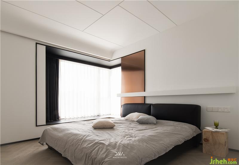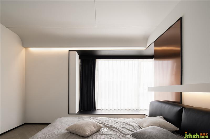 Lines and arc shapes have been running through the master bedroom. The elegant bed background is decorated with large pieces of rose gold, and a handsome demeanor immediately emerges.