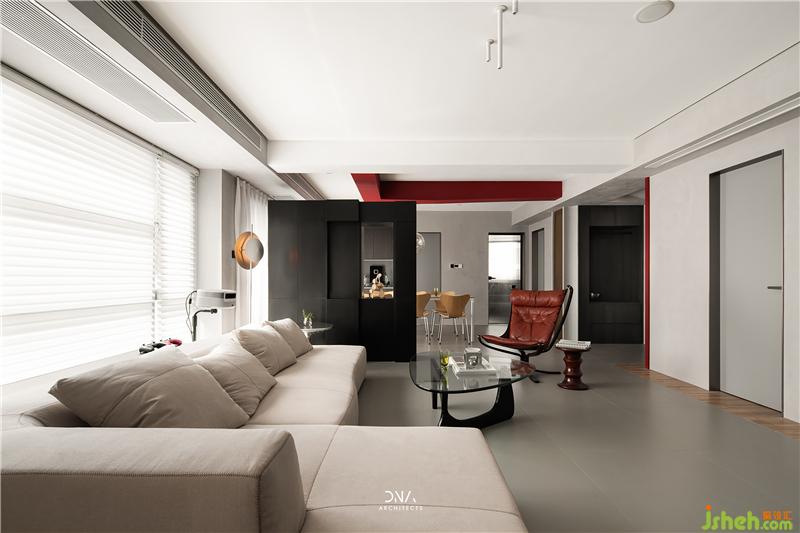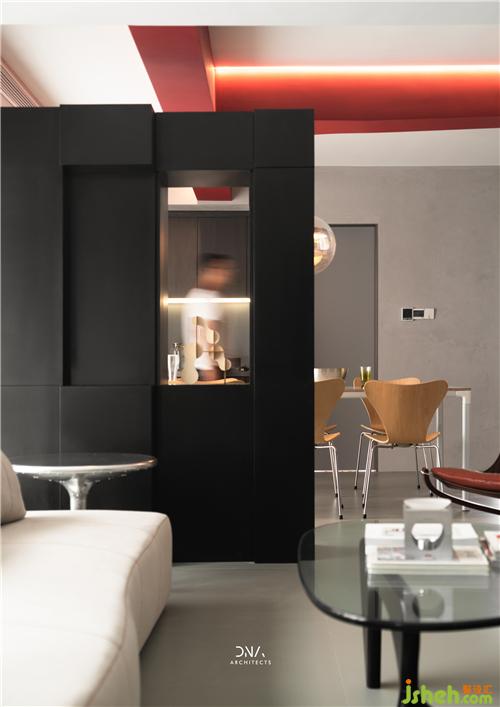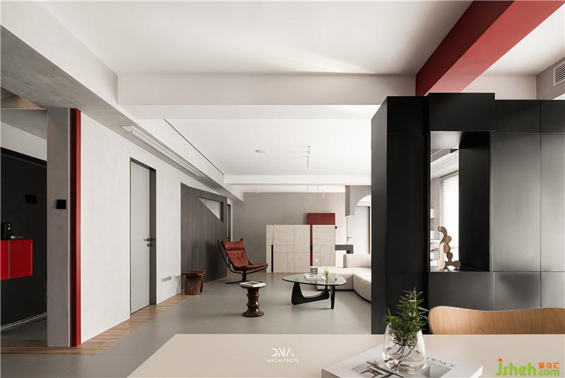不規(guī)則的幾何線條互相結(jié)合,無(wú)裝飾的立面造型,紅與黑的對(duì)撞色構(gòu)成了一個(gè)自由開(kāi)放的幾何平面,為空間奠定了風(fēng)格基礎(chǔ),為其注入了熱情和溫度。